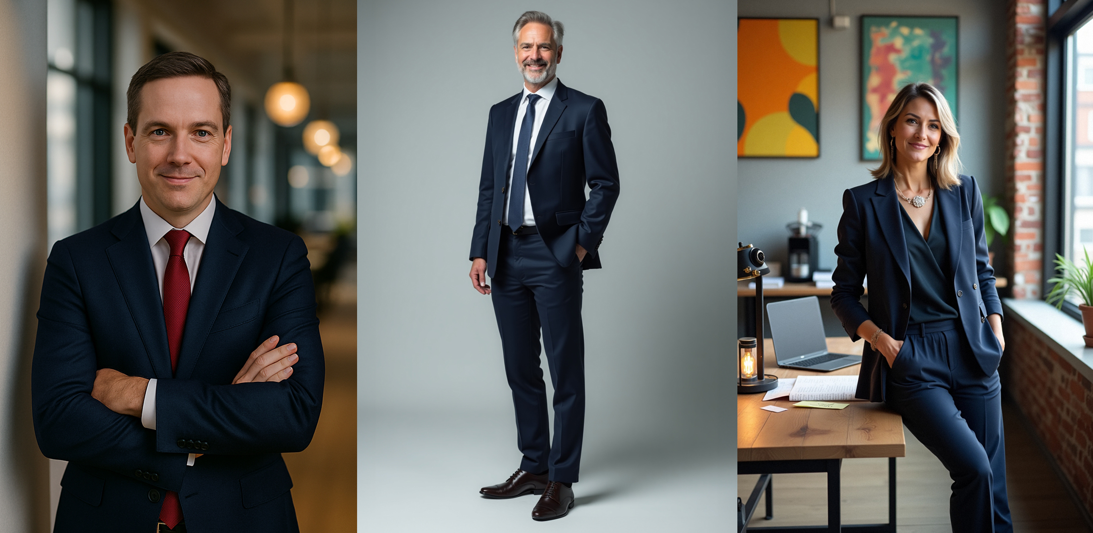 - Klassisk studioporträtt: Formell, professionell stil med kontrollerad ljussättning